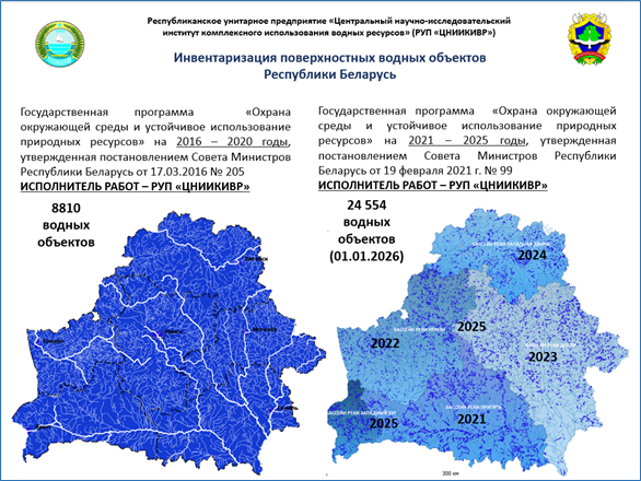 - Инвентаризация поверхностных водных объектов с целью верификации их местоположения, классификации в соответствии с Водным кодексом Республики Беларусь, ведения раздела «Реестр поверхностных водных объектов Республики Беларусь» государственного водного кадастра.